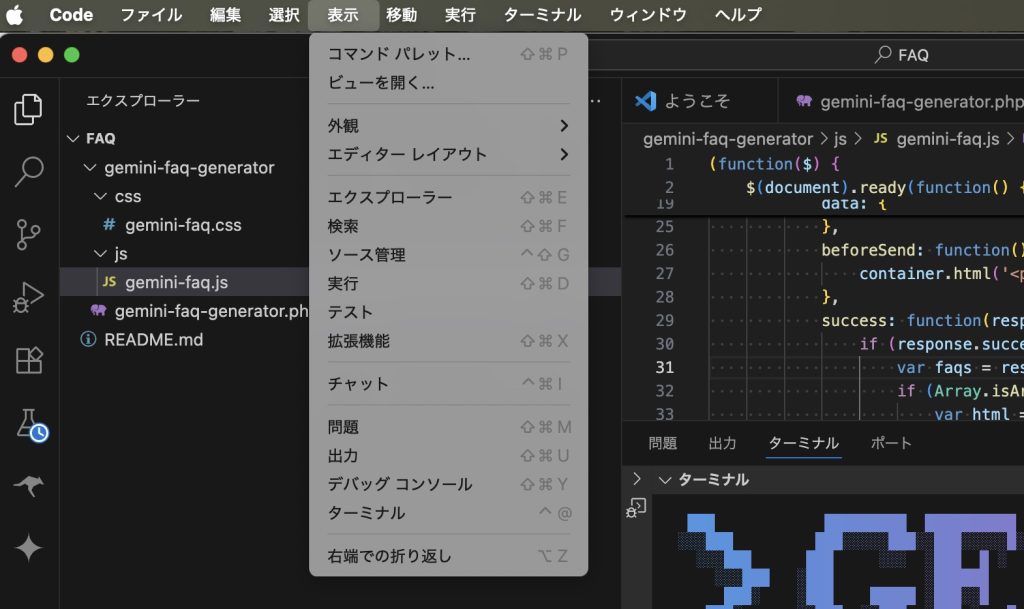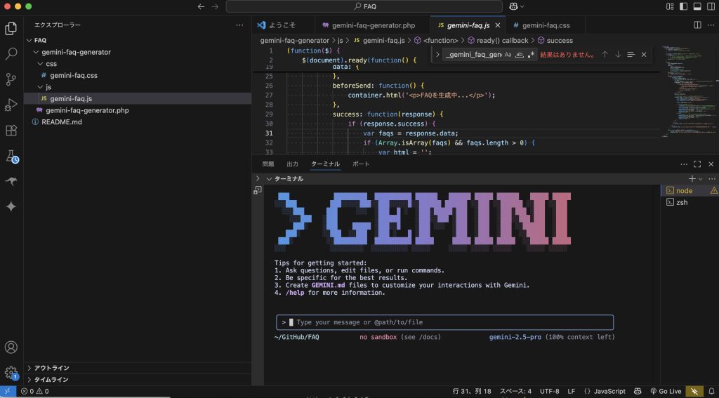 上記まで完了したら、Visual Studio Codeで利用することができるようになります。プロジェクトのフォルダを開き、ターミナルを表示しておきます。あとは先ほどと同じように、geminiのコマンドを打ち込めば、geminiとの自然言語での対話をスタートできます。